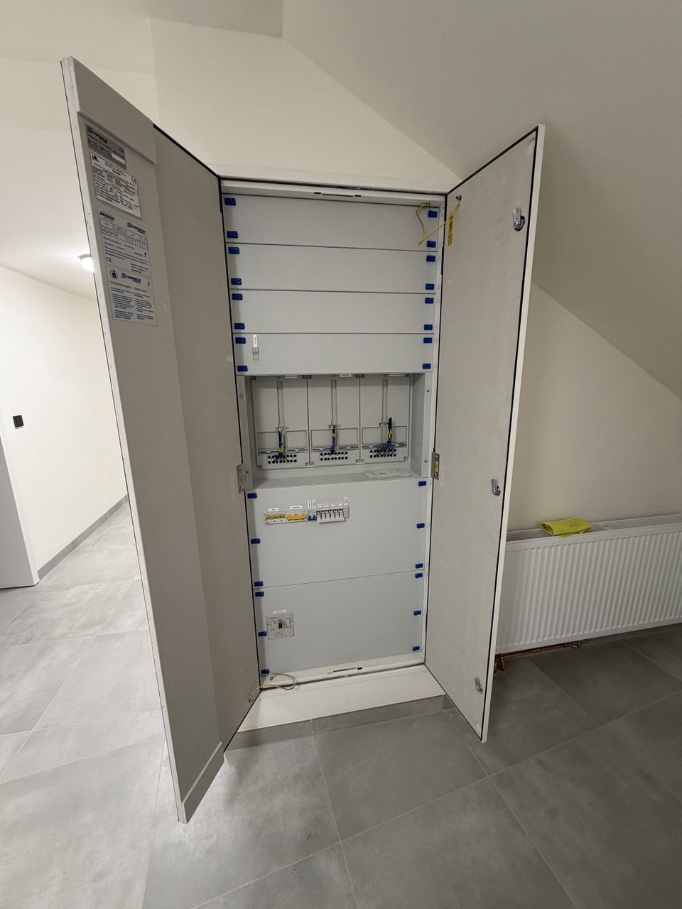 Na projektu bytového domu Fryčajka jsme realizovali kompletní elektroinstalaci na klíč – od silnoproudých a slaboproudých rozvodů přes zřízení elektrické přípojky až po závěrečné revize. Součástí zakázky byla také dodávka a instalace fotovoltaické elektrárny, která přispívá k energetické úspoře a modernímu provozu objektu. Díky komplexnímu řešení od jednoho dodavatele získal investor spolehlivý, bezpečný a energeticky efektivní systém splňující nejvyšší standardy kvality.